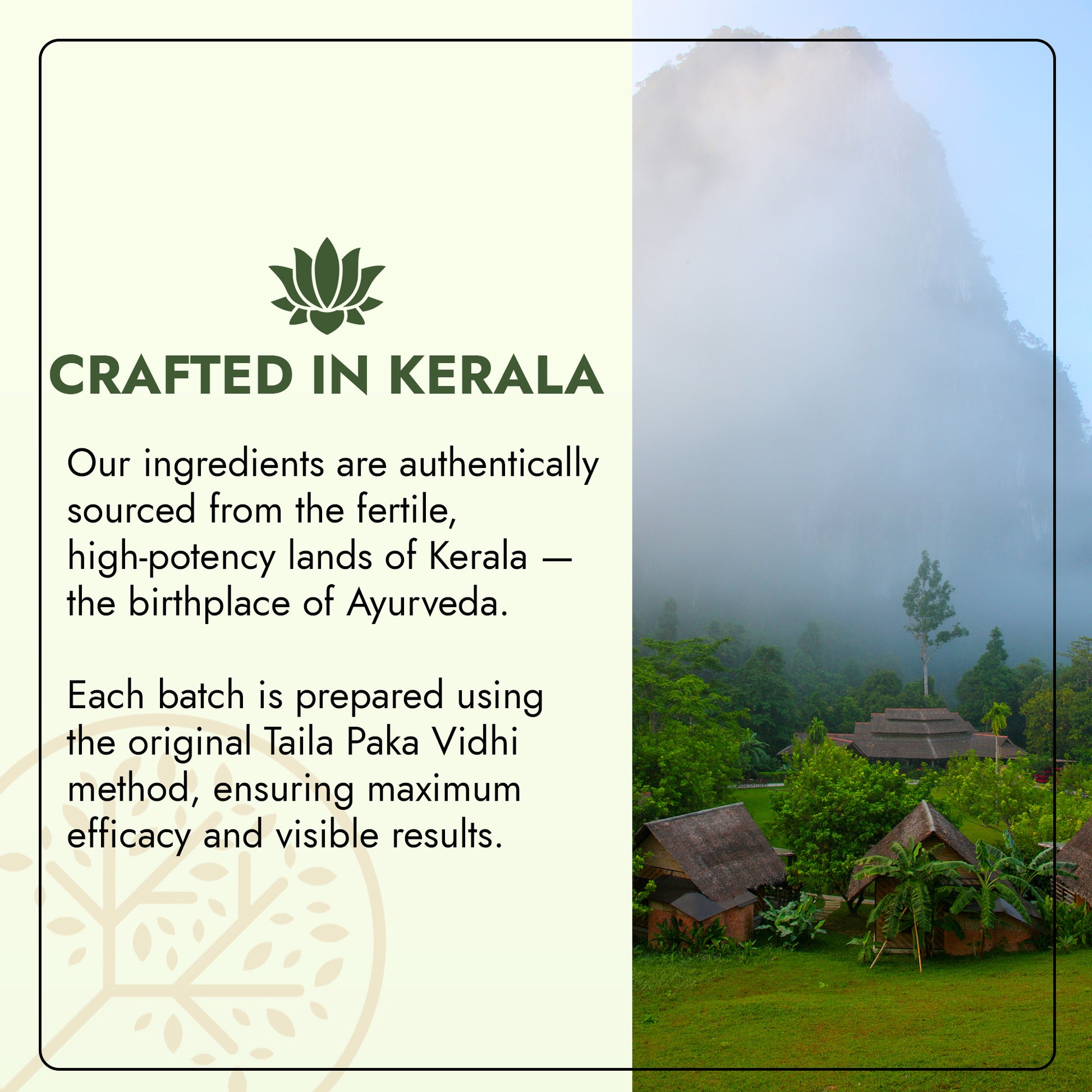Each drop is a blend of traditional Kerala botanicals that purify, soothe, and restore scalp health from within.