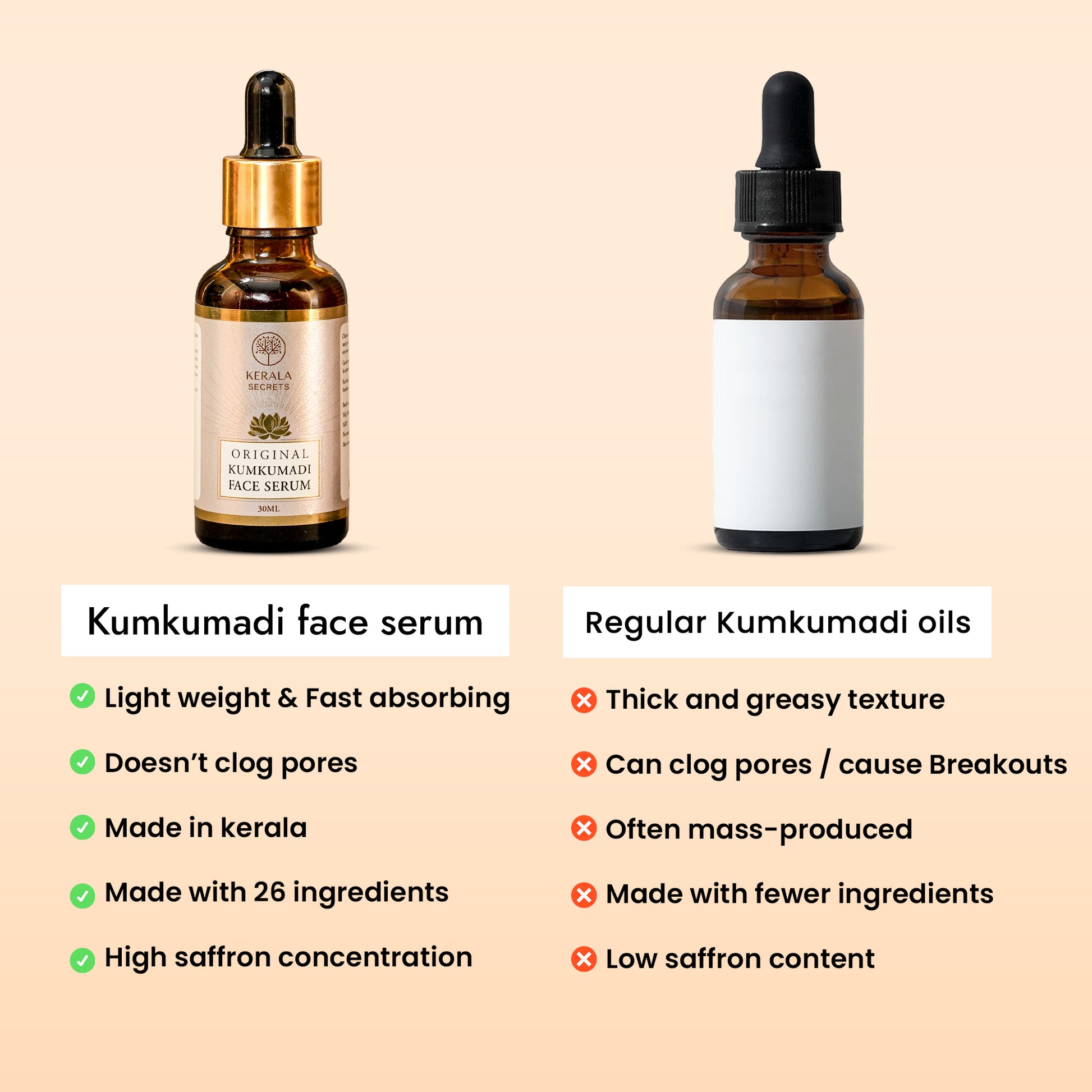Known as Liquid Gold in Ayurveda, Kumkumadi Face Serum has been revered for centuries  for giving women and men their brightest, most Radiant skin. Kerala Secrets' Kumkumadi recipe is crafted with premium saffron and 25 rare botanicals sourced from the potent lands of Kerala — the birthplace of Ayurveda skincare. This multi-ingredient powerhouse works at the root level to target today’s most common skin concerns.